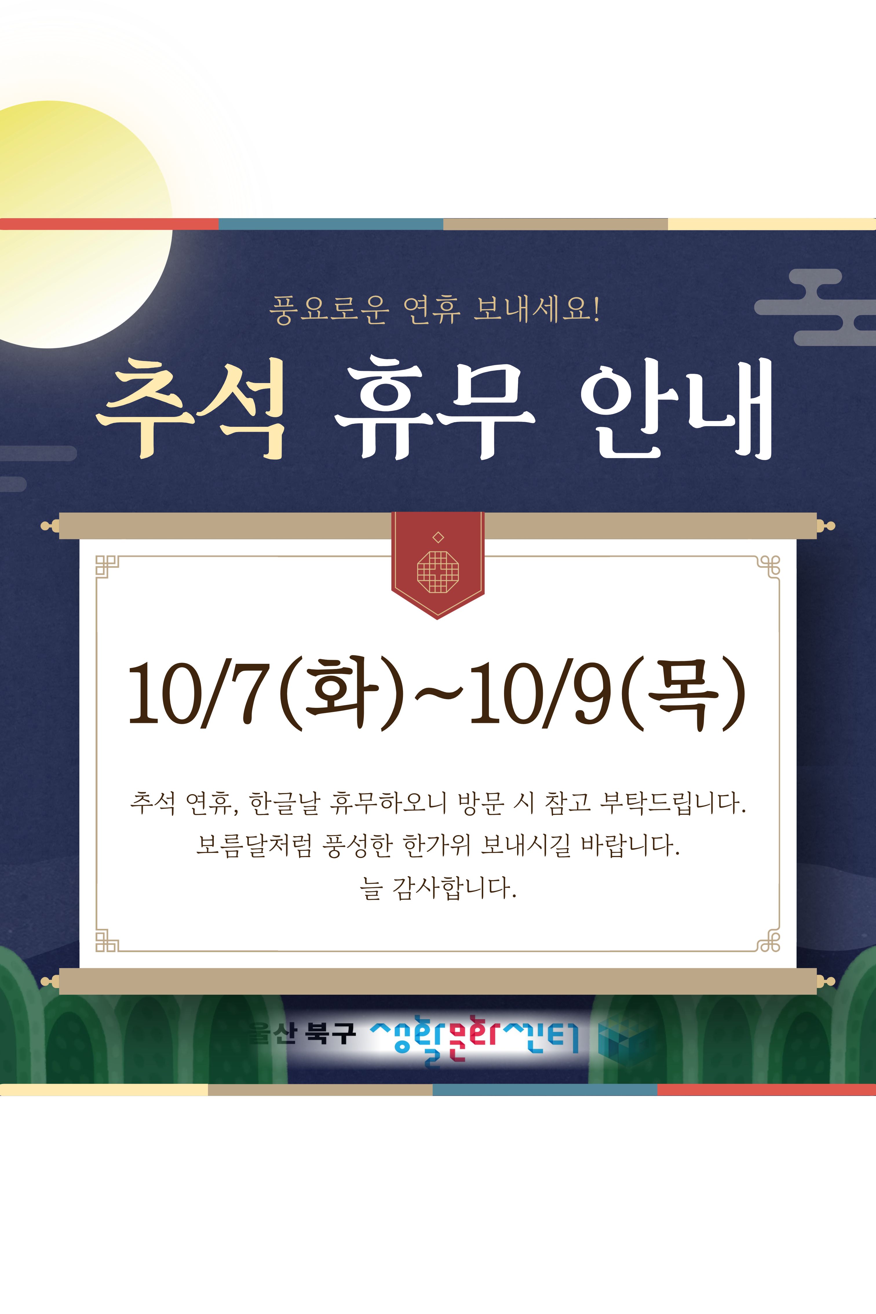 울산북구생활문화센터에서는 10월 7일(화) , 8일(수) 추석연휴 휴관이며,