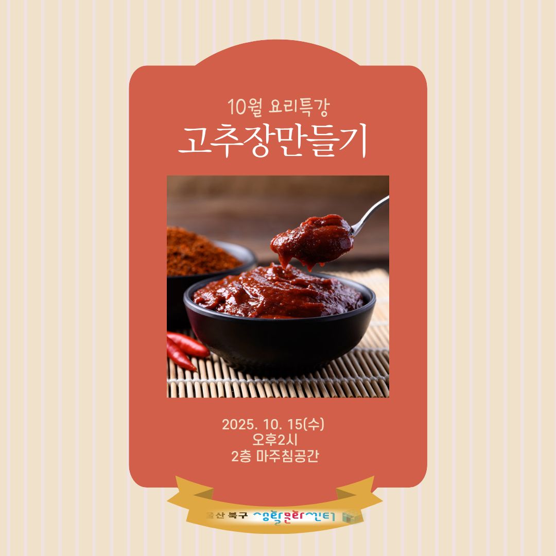 커뮤니티 공지사항[공지]10월 요리특강행사 <고추장만들기원데이>