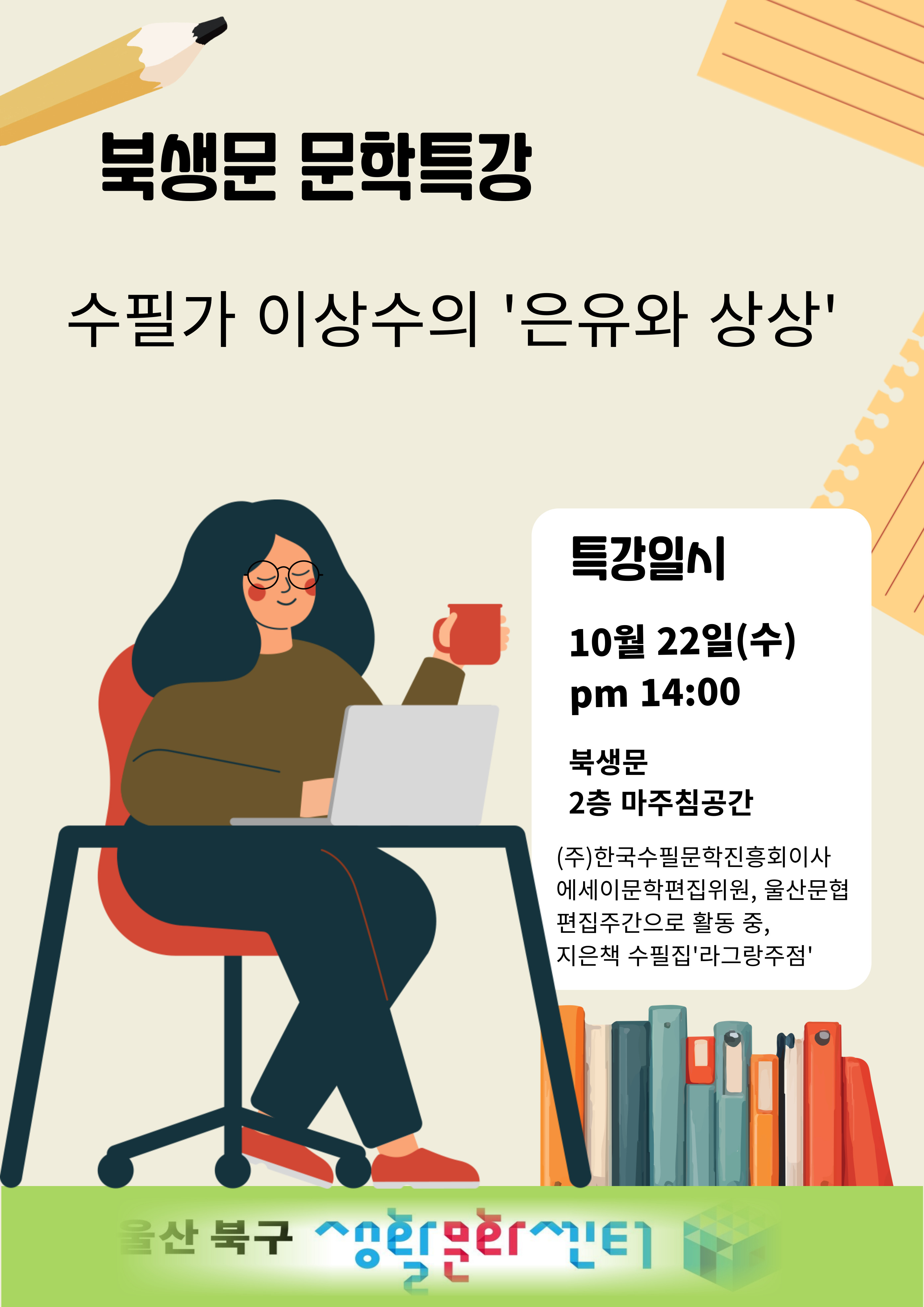 커뮤니티 공지사항[공지]10월 문학특강 <수필가 이상수의 '은유와 상상'>