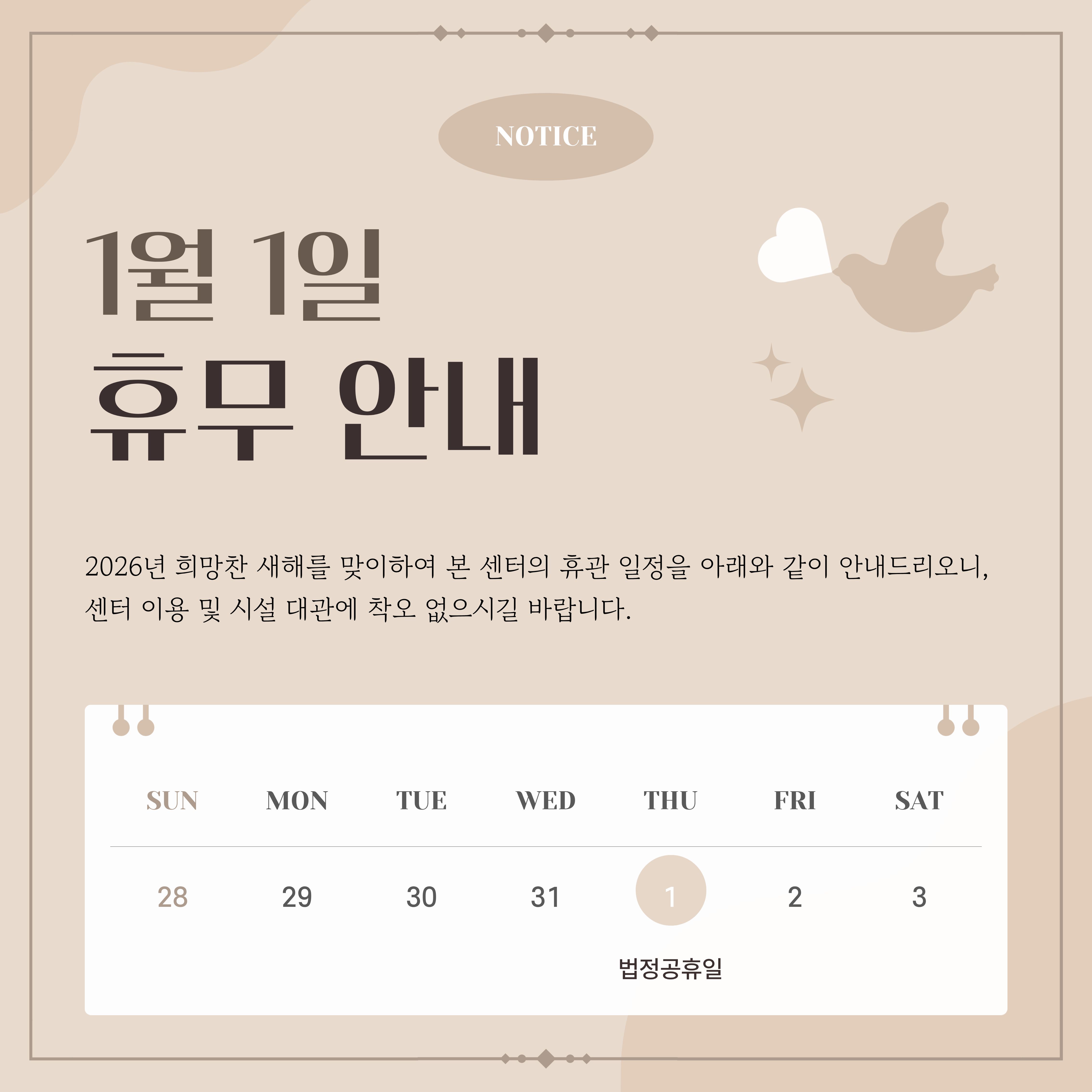 커뮤니티 공지사항[공지]2026 울산북구생활문화센터 1월 1일 신정휴관공지